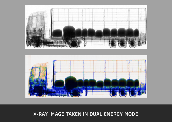 Scanning trucks with drivers inside: low dose for the cab switches to high dose for the cargo